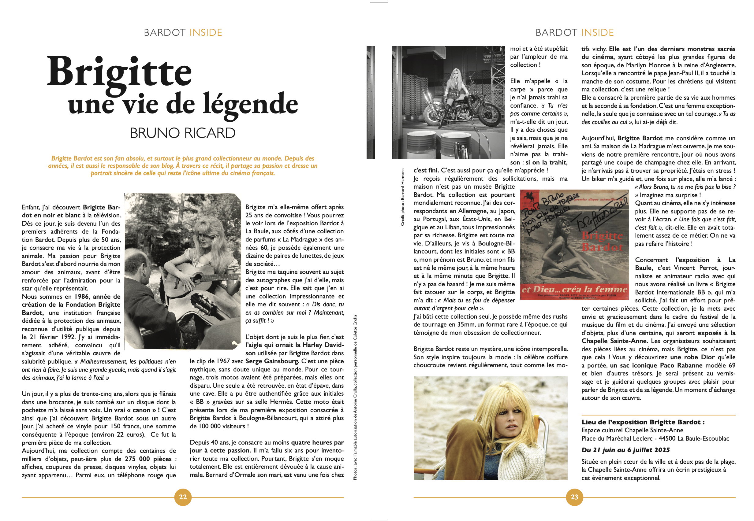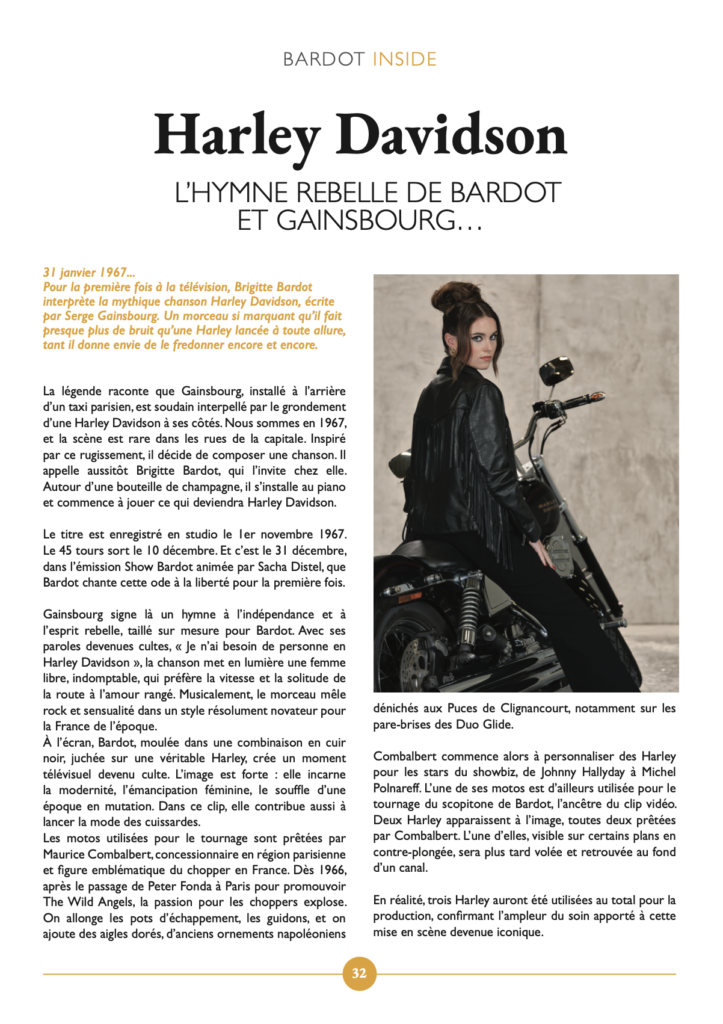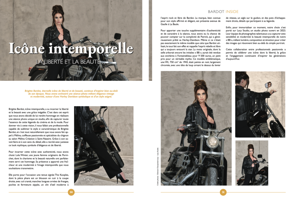 Les années ont passé, et c’est avec beaucoup de plaisir que nous avons souhaité, dans notre magazine, raconter sa vie autrement, sous un angle différent. Dans notre numéro de juin, nous avions eu comme un pressentiment. Nous avions décidé de lui rendre hommage, instinctivement, avec respect et admiration. Lola Winter accepta fièrement d’en faire la couverture et d’incarner, le temps d’une séance, notre Bardot, installée sur une superbe bécane de marque Harley-Davidson. Bardot elle-même avait vu cette couverture et avait ajouté avec sa légendaire simplicité : « Ils se sont bien débrouillés, les jeunes ».